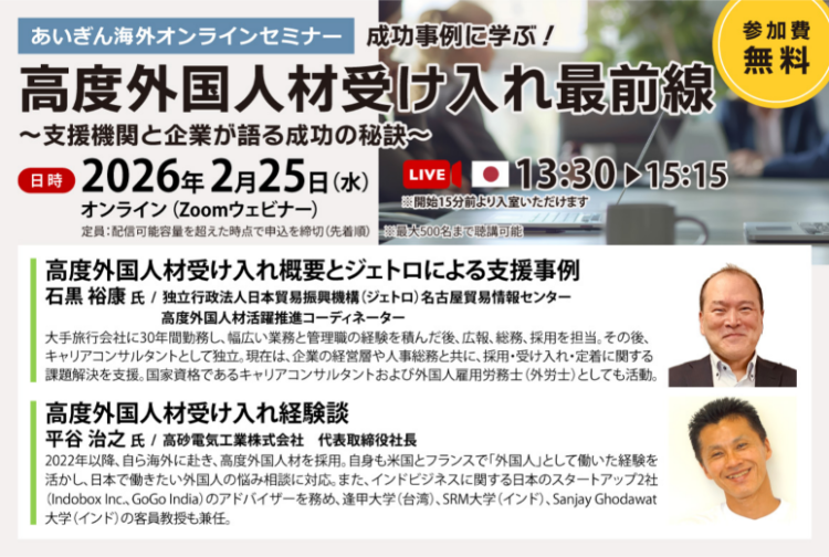 2/25(水)にあいぎん海外オンラインセミナー「成功事例に学ぶ!高度外国人材受け入れ最前線