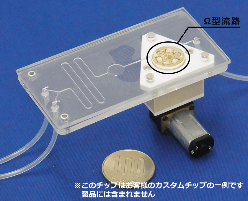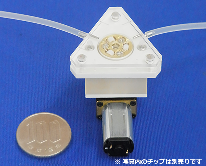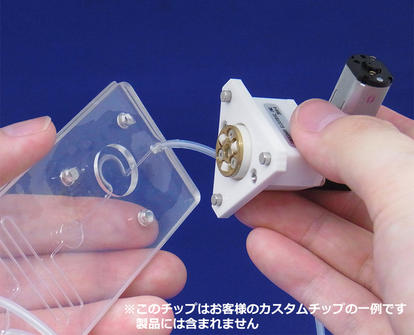 - 写真の一部は、お客様オリジナルPDMSチップにチップポンプを組み込んだ例です。