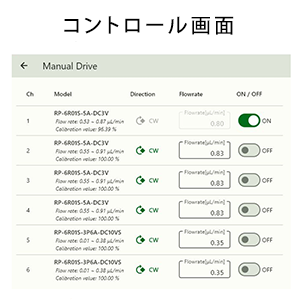 - ポンプの種類は、DCモーター、ステッピングモーターの両方の接続が可能です。