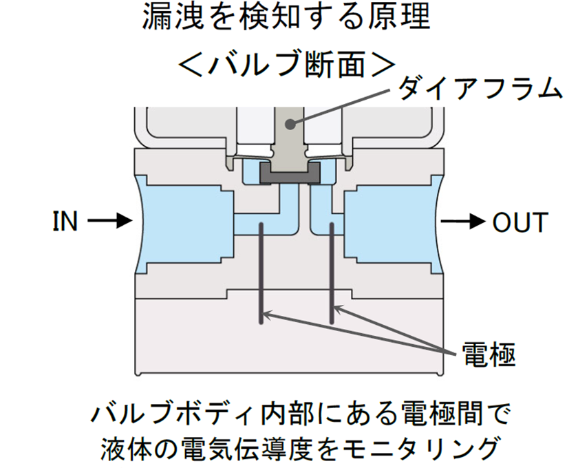- 逆に、開弁時に確実に液体が流れていることの確認も可能です。シール部の前後で電気伝導度を検出する原理ですので、気泡混入、液切れ、溶液の濃度変化なども、条件により検出できます。 ※1