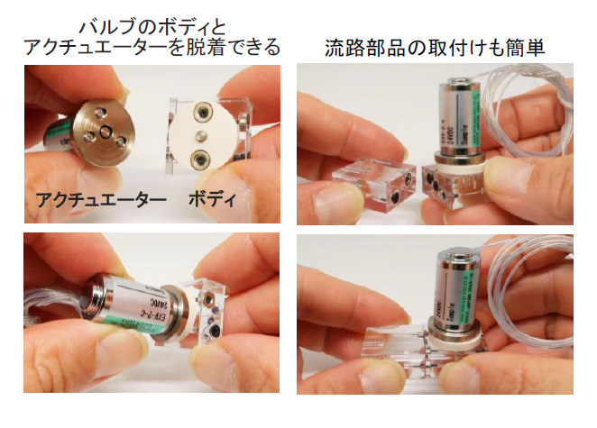 開発や実験の初期段階で、お好きなフロー図を容易に実現できます。 - 流路側面やバルブのボディとアクチュエーターの取付け面に磁石が付いており、簡単に交換できます。
